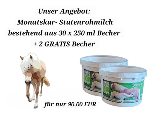 Wir bieten unsere Stutenmilch tiefgefroren in ¼ Liter- Becher zu einem Preis von 3,00 € pro Becher an. Wer sich für eine Monatskur entscheidet, kann sparen und bekommt 2 zusätzliche Becher geschenkt.